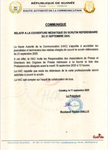 Scrutin référendaire du 21 sepembre 2025, la Haute Autorité de la Communication (HAC) invite les responsables des associations de presse et directeurs des organes de presse à lui fournir la liste des journalistes désignés avant le mardi 16 septembre 2025 à 12 heures. Et, informe que seuls les détenteurs de la carte professionnelle seront autorisés à couvrir le scrutin.