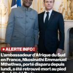 Lโ€™ambassadeur dโ€™Afrique du Sud en France, Nkosinathi Emmanuel Mthethwa, a รฉtรฉ retrouvรฉ mort ร  Paris ce mardi 30 septembre 2025, aprรจs avoir รฉtรฉ portรฉ disparu depuis lundi.