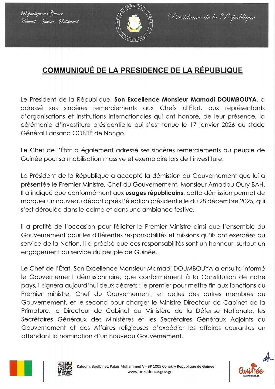 le Président de la République, Mamadi Doumbouya, a officiellement accepté la démission du gouvernement dirigé par Amadou Oury Bah. Présentée comme une étape institutionnelle conforme aux usages républicains, cette décision ouvre la voie à la formation d’une nouvelle équipe gouvernementale et marque le début d’un nouveau cycle politique après l’élection présidentielle du 28 décembre 2025.