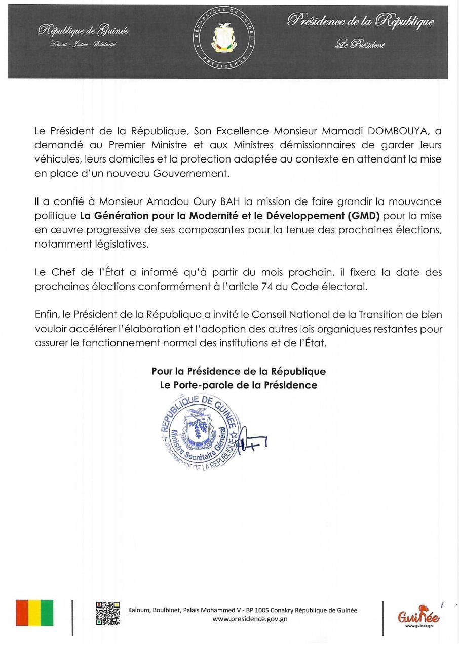Fin suspense :Désormais la démission du Gouvernement Bah Oury actée par le Président de la République.