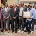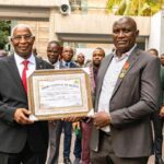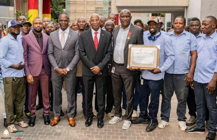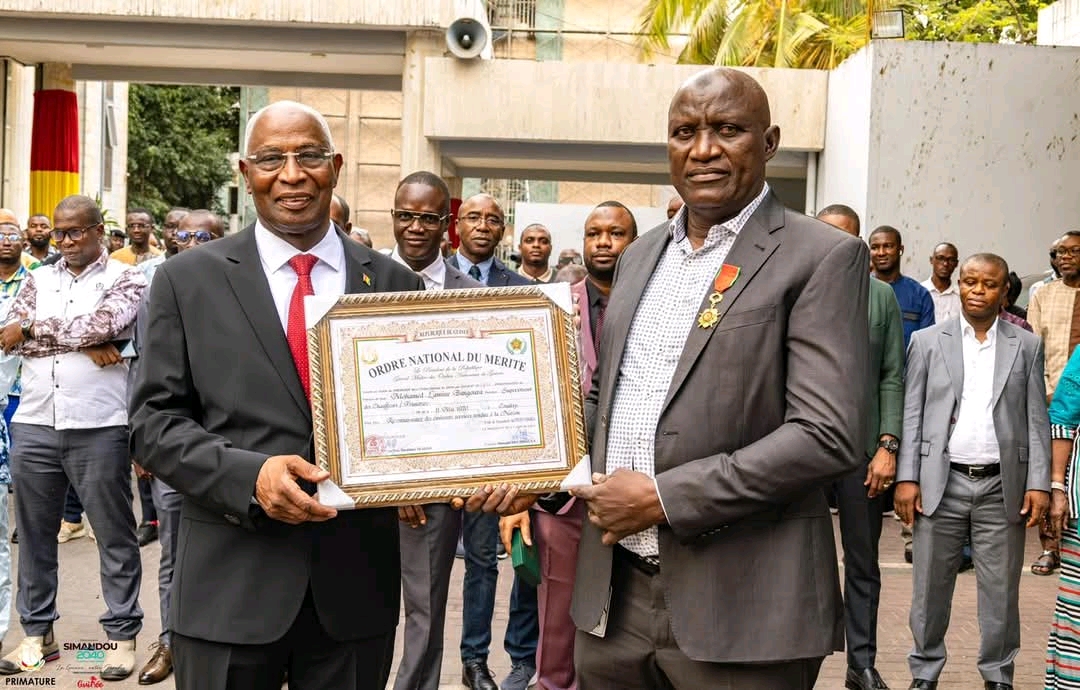 Monsieur Mohamed Lamine Bangoura a reรงu ses distinctions des mains du Chef du Gouvernement, Amadou Oury Bah, ร lโoccasion de la traditionnelle montรฉe des couleurs, en prรฉsence du personnel de la Primature.
