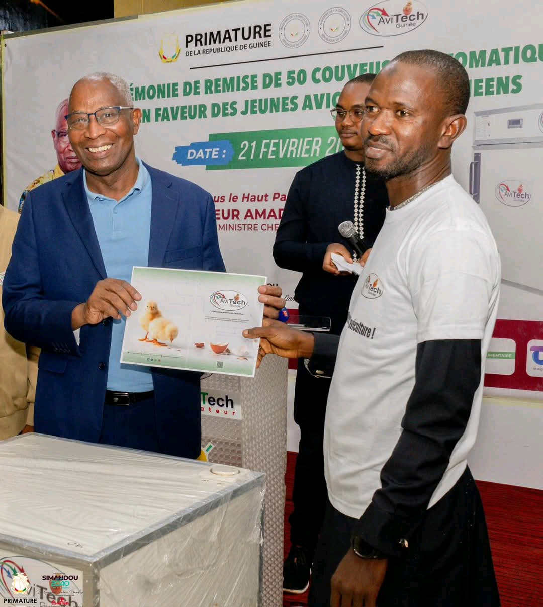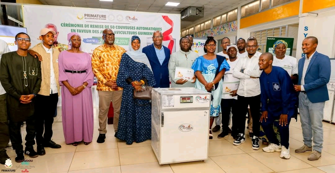 Conakry, le 21 fรฉvrier 2026 – Au nom du Le Premier Ministre Amadou Oury BAH, a prรฉsidรฉ la cรฉrรฉmonie officielle de remise de 50 couveuses automatiques au profit de jeunes aviculteurs guinรฉens.