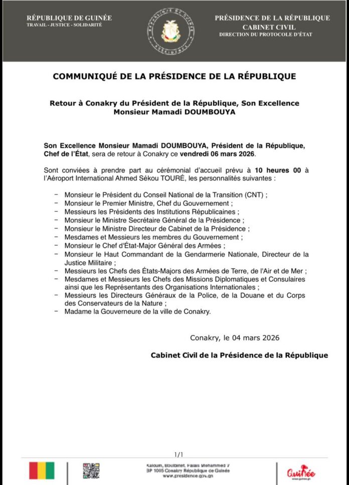 ACTUALITE Guinée :Le vendredi 06 mars manquera le retour du Président de la République aux bercail . Par Redacteur en Chef - 4 mars 2026 0 37 Facebook Twitter Pinterest WhatsApp Guinée : la date de retour du Président Mamadi Doumbouya annoncée pour ce 06 mars par le cabinet civil de la Présidence de la République de Guinée.