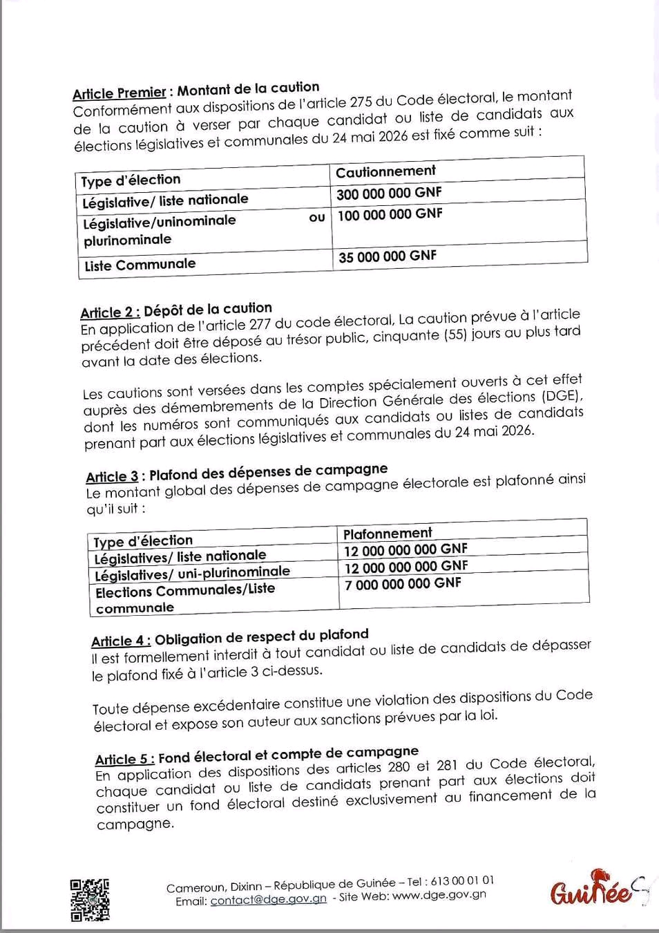 La DGE fixe les cautions de participation à 300 millions GNF pour les législatives (liste nationale); 100 Millions Gnf (liste uninominale et plurinominale)  et 35 millions GNF pour les communales.