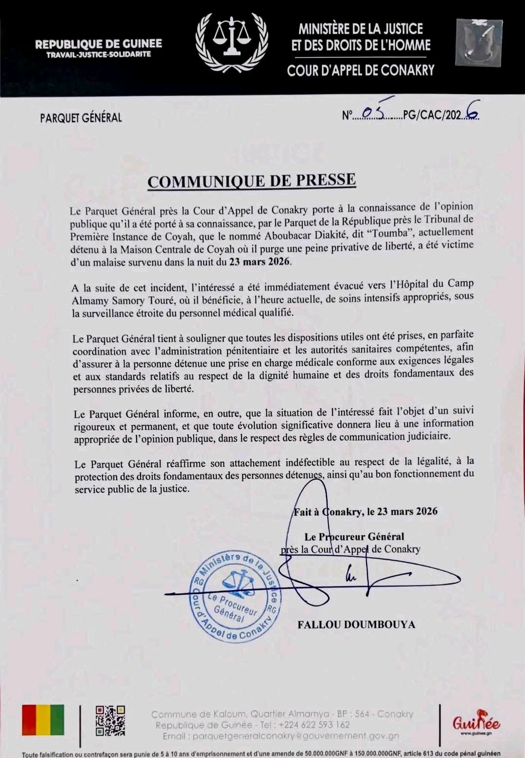 Dans un communiqué publié le 23 mars 2026, le Parquet général près la Cour d’Appel de Conakry annonce que le détenu Aboubacar Diakité, alias « Toumba », a été victime d’un malaise en détention à Coyah. Évacué d’urgence à l’hôpital du camp Almamy Samory Touré, il bénéficie actuellement de soins intensifs, tandis que les autorités assurent un suivi médical rigoureux dans le respect des droits des personnes privées de liberté.