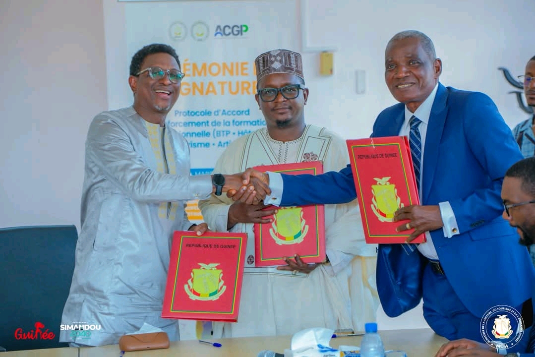 Conakry, 30 mars 2026 — Un nouveau cap vient d’être franchi dans la réforme de la formation professionnelle en Guinée. Le Ministère de l’Éducation nationale, de l’Alphabétisation, de l’Enseignement technique et de la Formation professionnelle, le Ministère de la Culture, du Tourisme et de l’Artisanat, l’Administration et Contrôle des Grands Projets (ACGP) et la Fédération Patronale du Tourisme et de l’Hôtellerie de Guinée (FEPATOUR) ont signé ce lundi un protocole d’accord stratégique. Ce partenariat consacre une convergence inédite entre politiques publiques, expertise technique et exigences du secteur privé.
